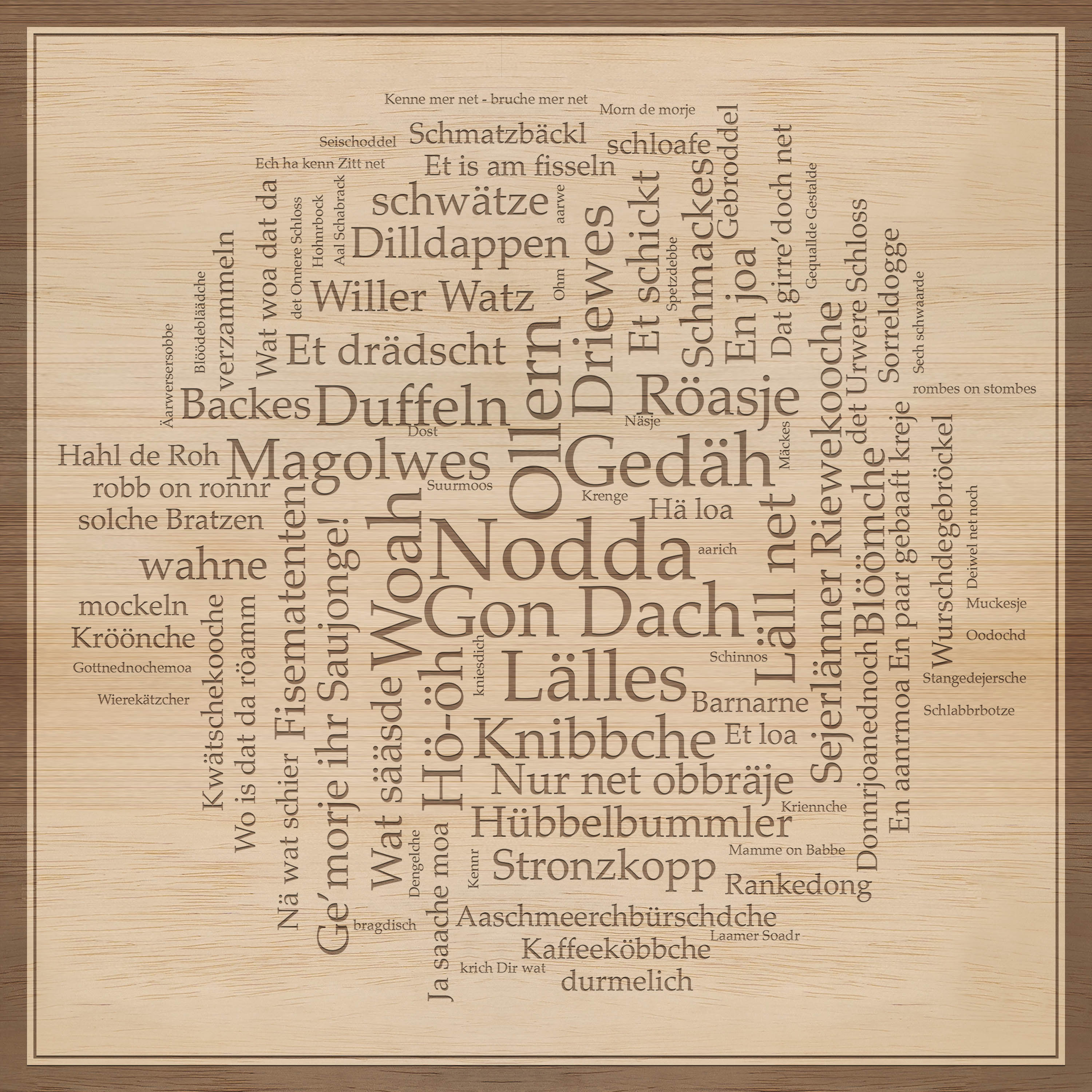 Wandbild mit Holzgravur – Wörtern aus dem Sejerlänner Platt.